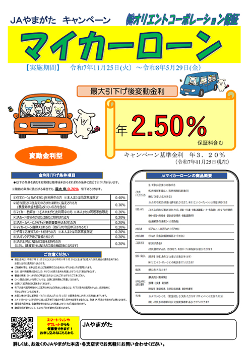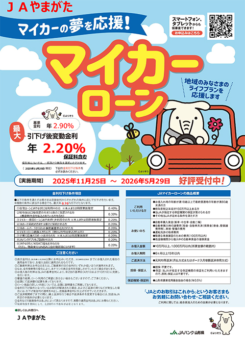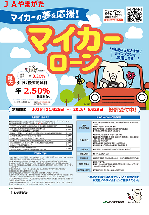 【JAやまがた本店 金融共済部 融資業務課】〒990-8535 山形県山形市旅篭町一丁目12番35号 TEL.023-624-8269 FAX.023-624-8284